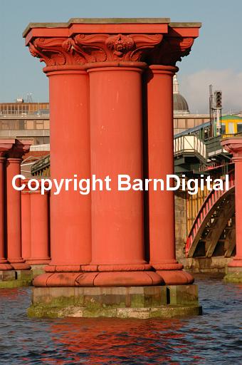 The ornate red-painted pillars of the partially dismantled old Blackfriars railway bridge still stride across the River Thames to Blackfriars in the City of London. The bridge, also known as the Alexandria Railway Bridge and the St Paul's Railway Bridge, was designed by Joseph Cubitt for the London, Chatham and Dover Railway and opened in 1864. It was dismantled in 1984. Southwark, London, UK. 15 November 2005.