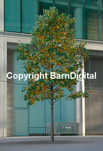 A small plane tree with autumn leaves grows in a paved area between office blocks. South Bank of the River Thames at Lambeth. London, UK. 16 November 2005.