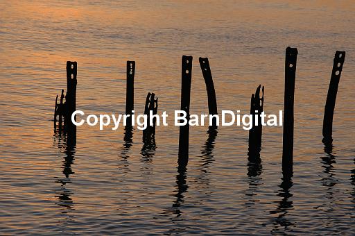 Rusting iron posts, the remains of an old jetty, against a dramatic evening sky are reflected in the sea. Newhaven, Sussex. UK. 19 November 2005