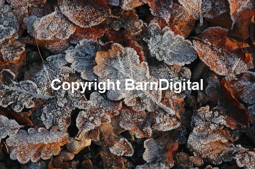 leaf tree season autumn fall winter frost ice hoar rime rimy freeze white dead dry colour red brown orange abscission deciduous plant tree science nature BarnDigital Barn Digital Michael Grant beech family Fagaceae