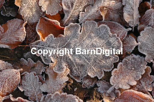 Fallen leaf of the Pedunculate Oak (Quercus robur) coated by the first heavy frost of Autumn. Bedgebury Forest, Kent, UK. 20 November 2005