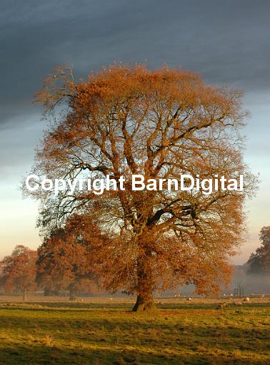 Sheep graze under a mature Pedunculate or Common Oak (Quercus robur) tree in park land. The last of the autumn leaves are hightlghted by the evening sun and a stormy sky. Sissinghurst, Kent. England, UK. 11 December 2005