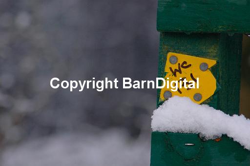 yellow arrow sign way marker path wc131 track walk ramble travel ramblers association public access right of way snow ice cold Michael Grant Barn Digital BarnDigital