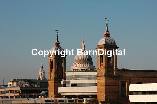 The dome of Sir Christopher Wren's St Paul's Cathedral is framed by the Victorian twin brick towers of Cannon Street Station.The station is in the heart of London's financial district on the north bank of the River Thames. It was built for the South Eastern Railway in 1867 by Sir John Hawkshaw. City of London, England, UK. 28 December 2005.