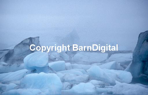 Icebergs break off the Vatnajokull icecap where the Breddamerkur glacier meets the sea in a lagoon at Jokulsarlon. The icecap can just be discerned in the background through the mist. Iceland. Jokulsarlon. July 2000