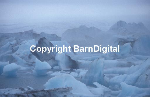 Icebergs break off the Vatnajokull icecap where the Breddamerkur glacier meets the sea in a lagoon at Jokulsarlon. The icecap can just be discerned in the background through the mist. Iceland. Jokulsarlon. July 2000