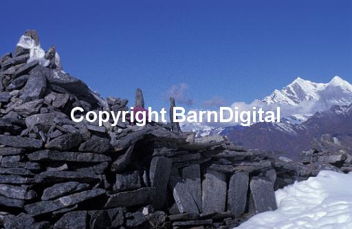All mountain passes are sacred, this one particularly so as it is on the path to the pilgrimage destination of Panche Pokari. It is marked by a prayer wall and flags and shawls. Eastern Nepal. October 1999.
