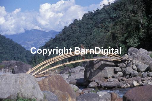 A simple but functional bridge made from Bamboo poles. Dobhan. There are many small rivers in this sparsely populated area. Permanent bridges are not economically viable so many temporary structures are built. Eastern Nepal. October 1999.