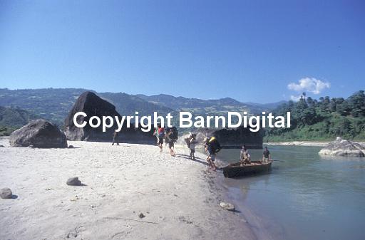 A flat bottomed ferry boat disembarking travellers on the sandy banks of the swift flowing Arun Khosi. This river is older than the Himalaya and as the mountains rose it carved through them from the Tibetan plateau southwards. Eastern Nepal. October 1999.