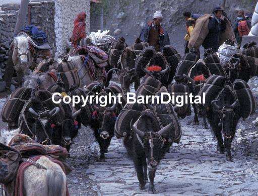 A pack of loaded yaks hogs the road at Jomson. Yaks are bad tempered, aggressive, sickly and do not carry heavy loads. However they can work at higher altitude than mules or oxen. Mustang, Nepal. April 2001